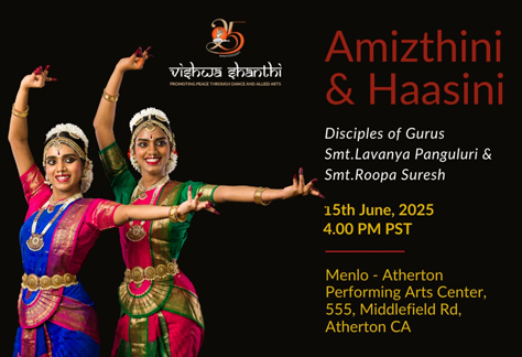 Please join us on Sunday, 15th June, 2025 for the Arangetram of Kum. Amizthini Arivazhagan & Kum. Haasini Arivazhagan at Menlo Atherton Performing Arts Center, 555 Middlefield Rd, Atherton CA.