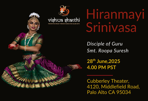 Arangetram – Hiranmayi Srinivasa Please join us on Saturday, 28th June, 2025 for the Arangetram of Kum. Hiranmayi Srinivasa at Cubberley Theater, 4120 Middlefield Road, Palo Alto, CA 95034. Kindly be seated by 3:30 pm for a prompt start. Attendance to this event is by invite only. Orchestra Ensemble for the Evening: Nattuvangam: Smt. Roopa Suresh Vocal: Smt. Manasa Suresh Mridangam: Sri. Srinath Bala Violin: Smt. Sandhya Srinath Photography & Videography: Sri. Siva Dhanasekaran – Silicon Valley Photography Make Up Artist: Smt. Priyanka Raghuraman We look forward to seeing you there! + Add to Google Calendar + iCal / Outlook export Date Jun 28 2025 Expired! Time 4:00 pm Location Cubberley Theater, Palo Alto Share this event